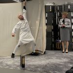 Wie kommt Dorfrichter Adam zu Fall? Dies wurde am 11.03.26 vom THEATERmobileSPIELE aus Karlsruhe in einer kreativen Inszenierung von Kleists Bühnenstück und der Abipflichtlektüre „Der zerbrochne Krug“ gezeigt. Zum Greifen nah erlebte das Publikum das Schauspiel und verfolgte mit vielen verschiedenen Emotionen die Aufführung. Vor rund 180 Schülerinnen und Schülern schlüpften zwei Schauspieler abwechselnd in die Rolle aller Figuren und spielten anschaulich unter Zuhilfenahme von körpergroßen Puppen den Prozess um den zerbrochenen Krug. Die Vorstellung war aus diesem Grund „anders“ als gewöhnlich, meldeten Schülerinnen rück, denn „normalerweise werde im Theater jede Rolle von einem eigenen Schauspieler bekleidet“. Daran werden sich vielleicht einige der Oberstufenschüler noch bei der Vorbereitung auf die bevorstehenden Abiturprüfungen erinnern. Vielleicht auch daran, dass aus Gerichtsrat Walter eine Gerichtsrätin wurde, denn dies war überraschend und wurde auch im anschließenden Nachgespräch hinterfragt. Interessant war darüber hinaus das Bühnenbild, bei dem Aktenordner als Sinnbild für Prozessakten und eine vorhandene Ordnung standen. Diese wurden nach und nach abgenommen, sodass die Fassade der Hauptfigur, Dorfrichter Adam, und ihre Macht zu bröckeln begann. Zeugenaussagen deckten das Lügenkonstrukt des Dorfrichters nach und nach auf. Auch der rote Faden, der von Adam innerhalb des Bühnenraums verlegt wurde, half schlussendlich nicht mehr, die Fährte, die zu ihm führte, zu verschleiern. Sein Machtmissbrauch vor allem bei der jungen Eve wurde auch in dieser Inszenierung aufgedeckt und er floh aus dem Gerichtssaal. Wir bedanken uns herzlich für die gelungene Inszenierung des Ensembles und die Möglichkeit anschließend Fragen zu stellen. Wir freuen uns bereits auf eine weitere Vorstellung im nächsten Jahr.